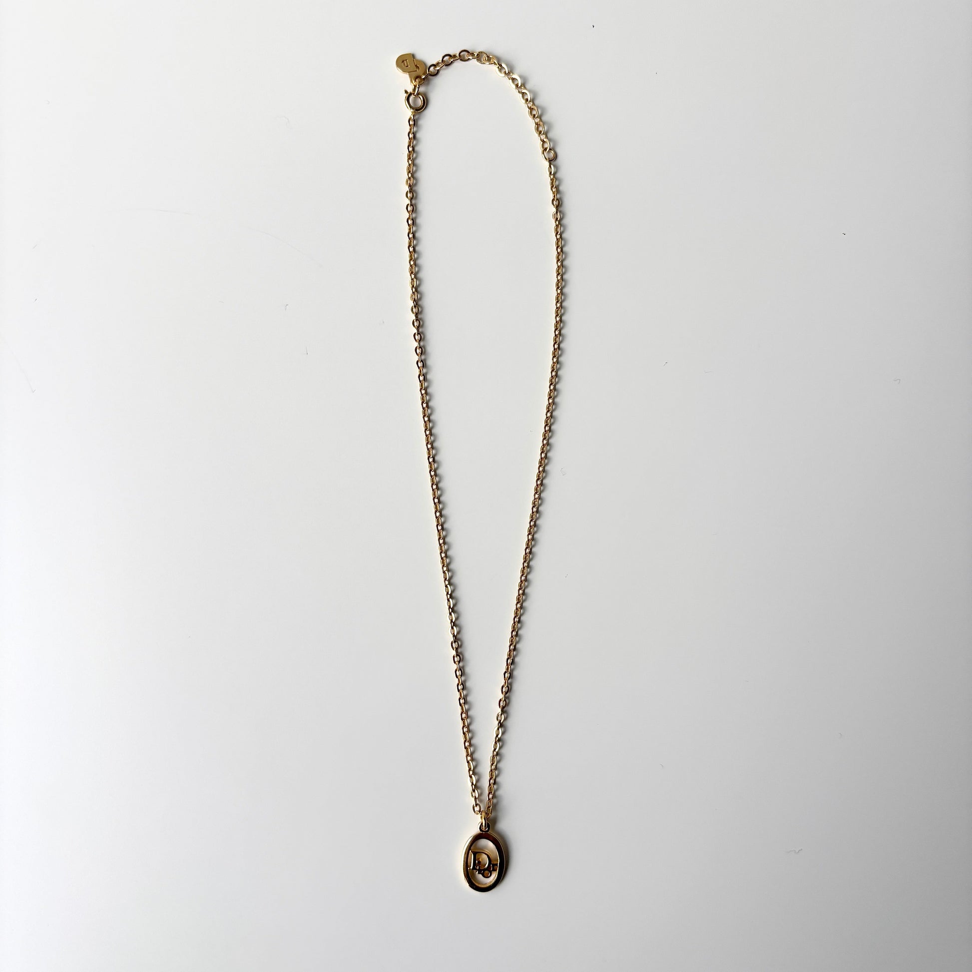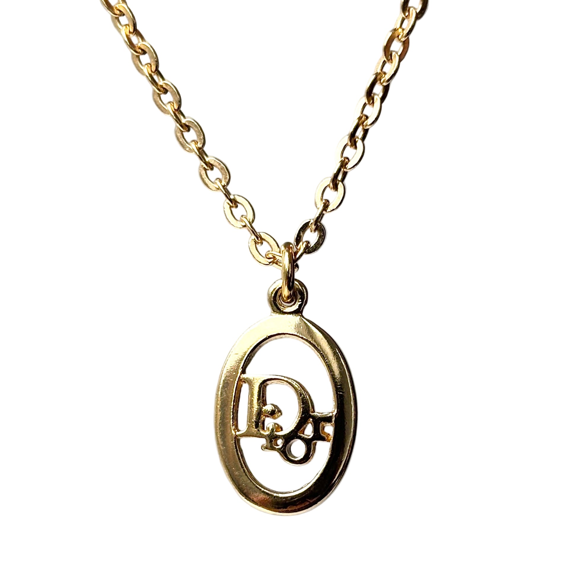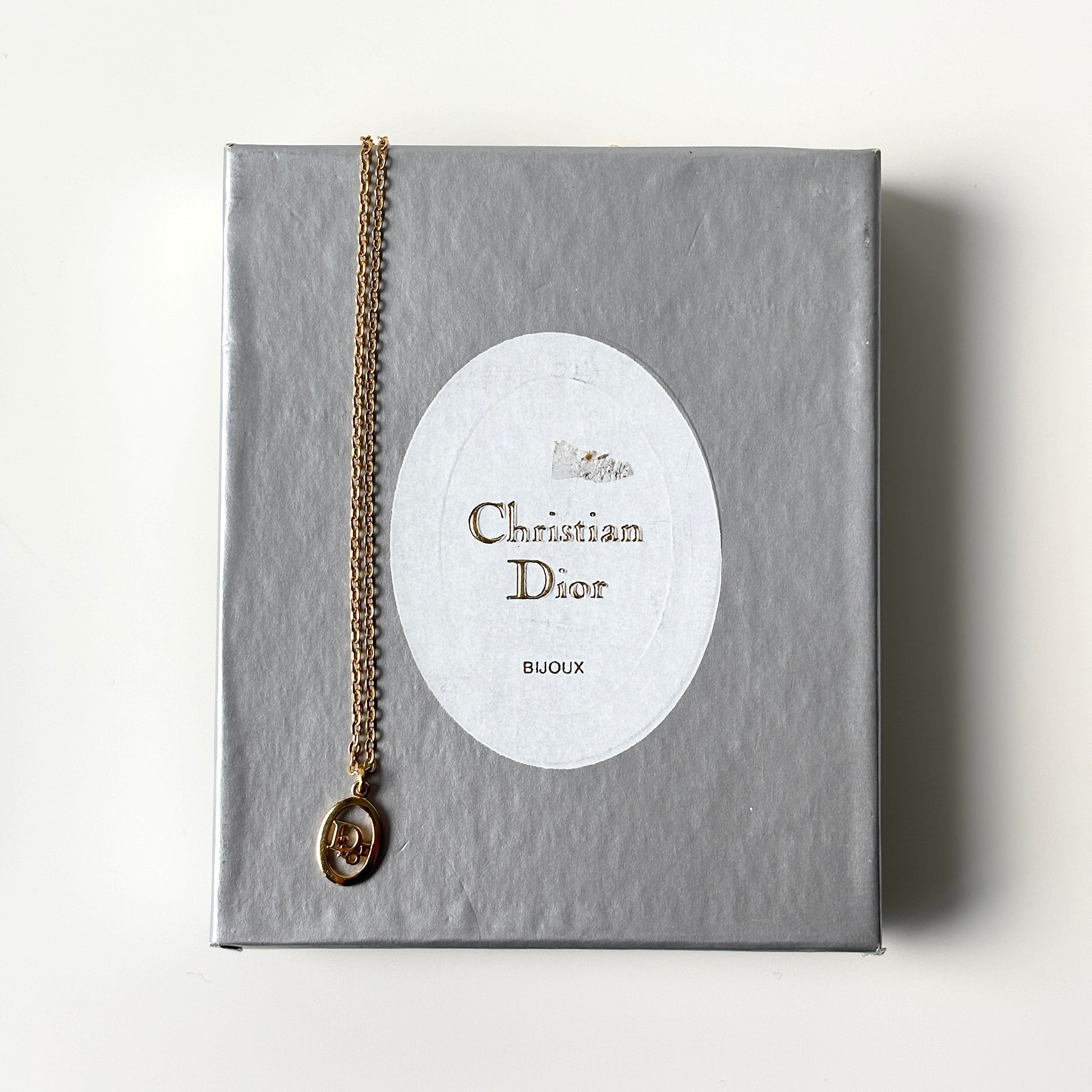 Authentic vintage Christian Dior chain necklace with pendant featuring floating Dior logo motif in an oval frame.