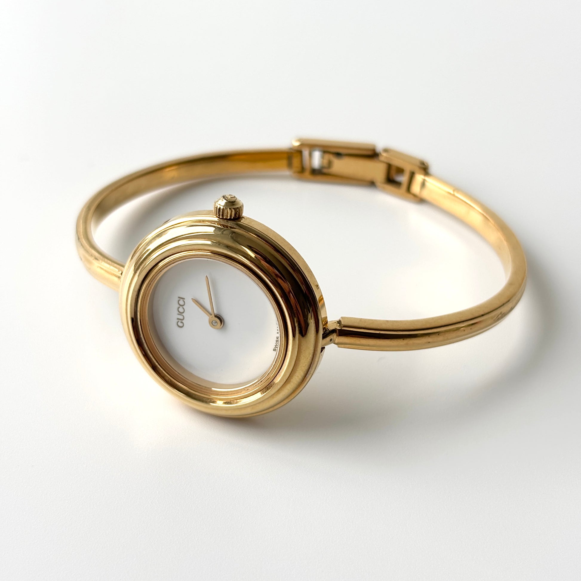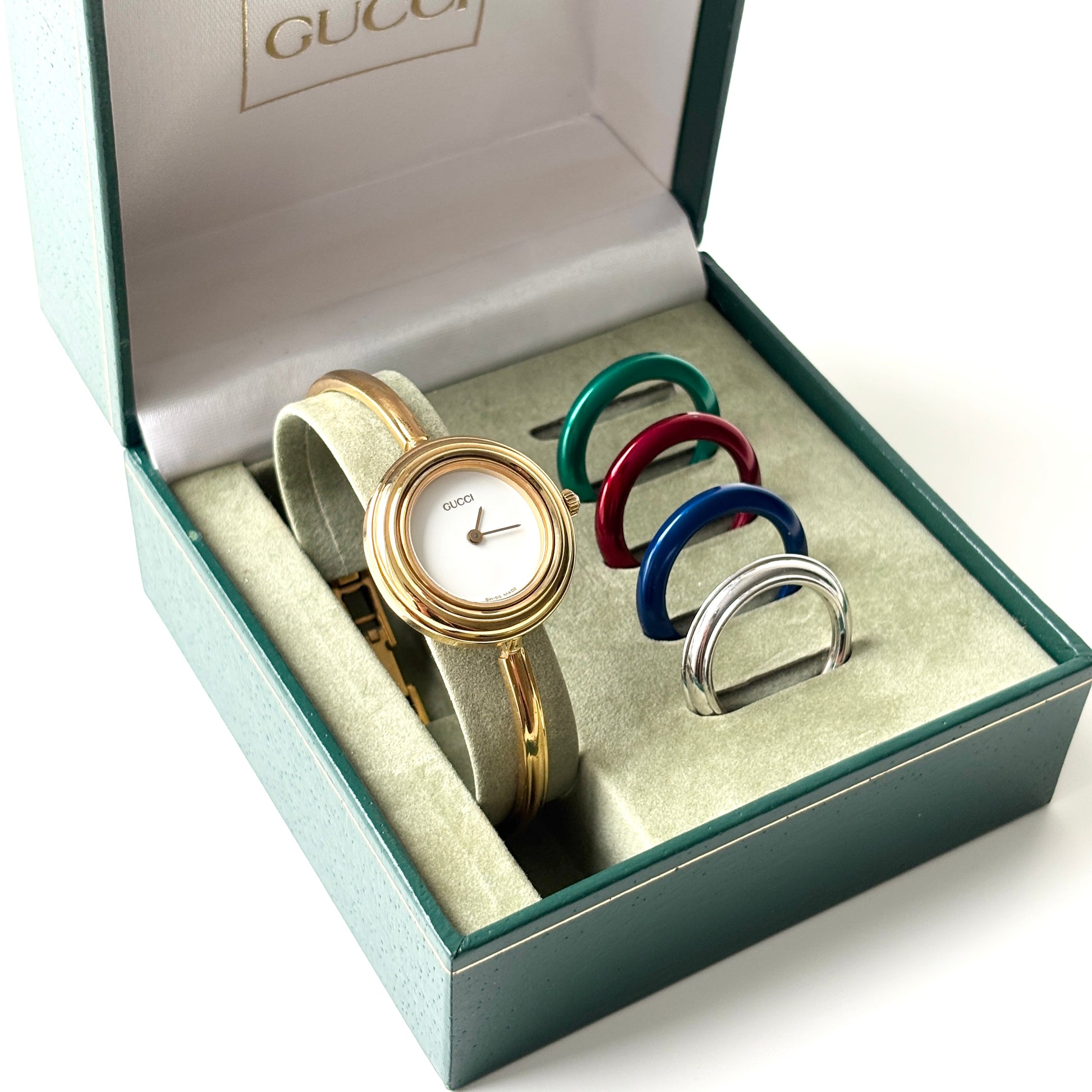 Authentic vintage Swiss-made Gucci Timepieces Change Bezel 11/12.2 watch with 5 assorted metal bezels. A classic Gucci design first released in the 80s with interchangeable bezels.