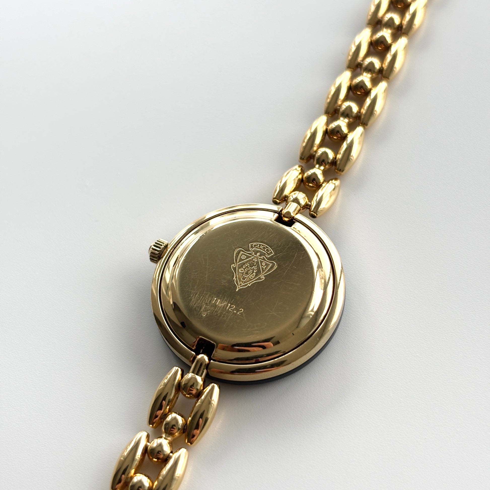 Authentic vintage Swiss-made Gucci Timepieces Change Bezel 11/12.2 watch with 6 assorted bezels. A classic Gucci design first released in the 80s with interchangeable bezels.