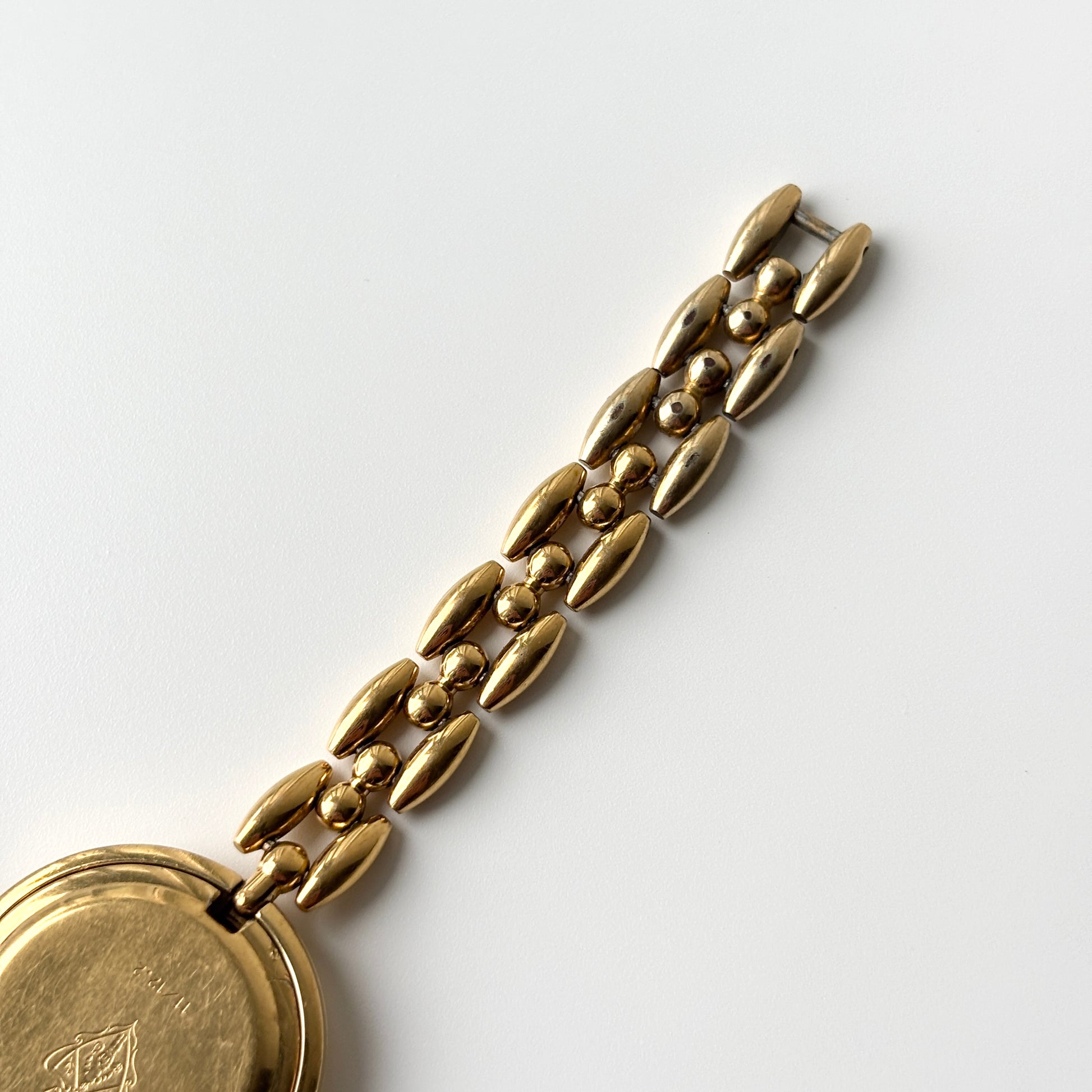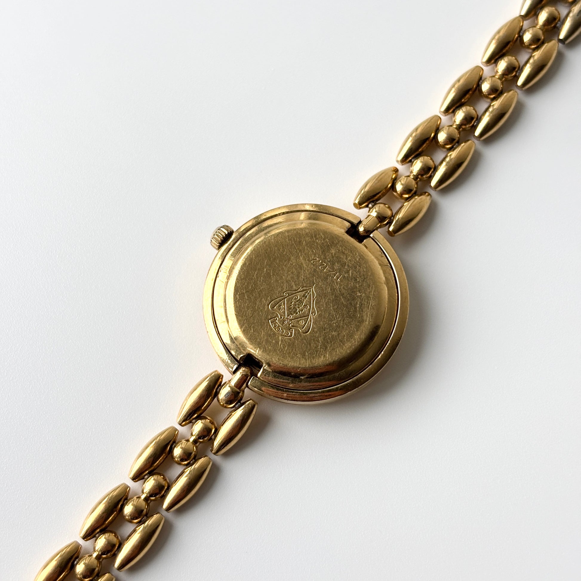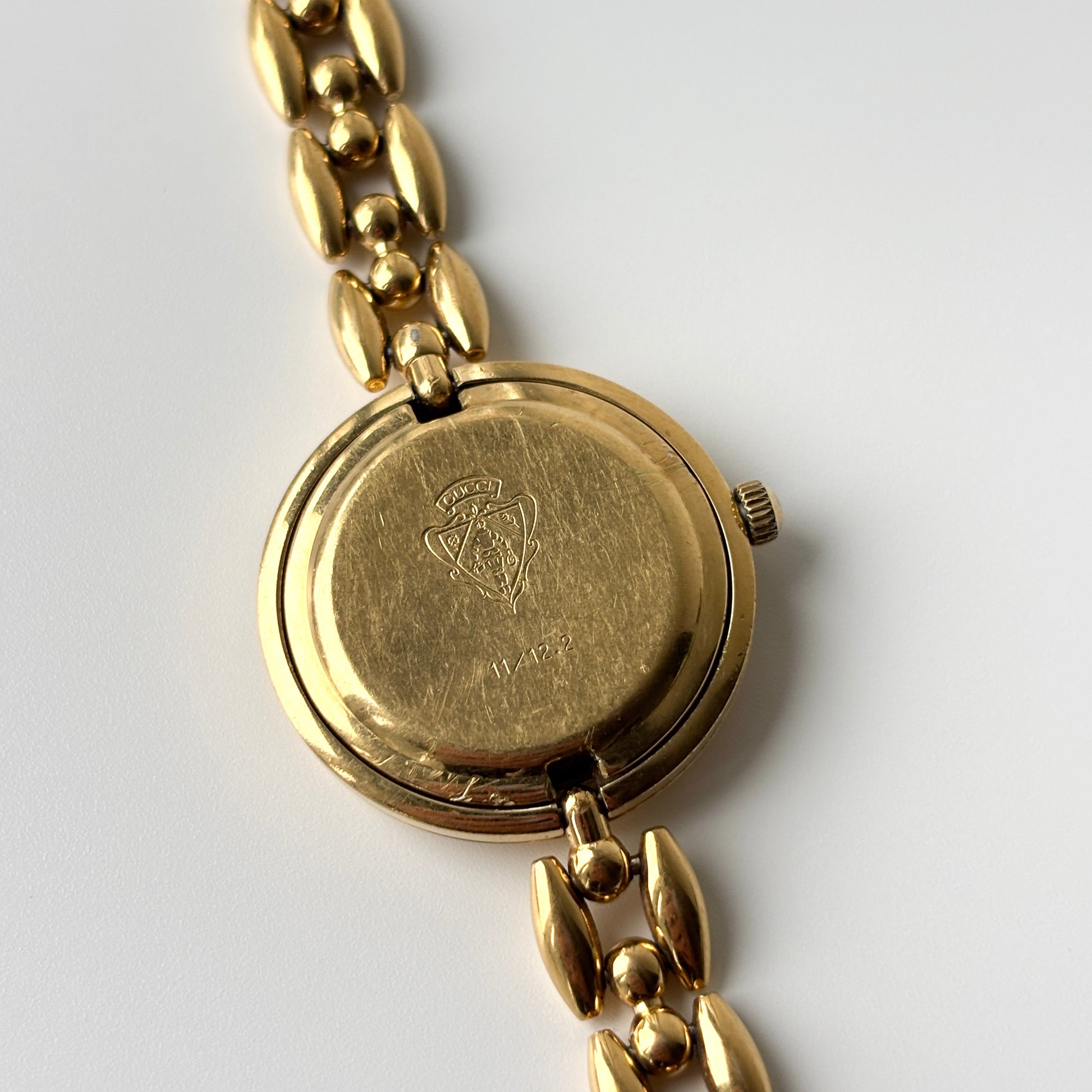Condition: Good preowned condition - functional with minor signs of wear. Scratches on hardware and crystal, faded gold plating in small areas, minute chips near clasp.