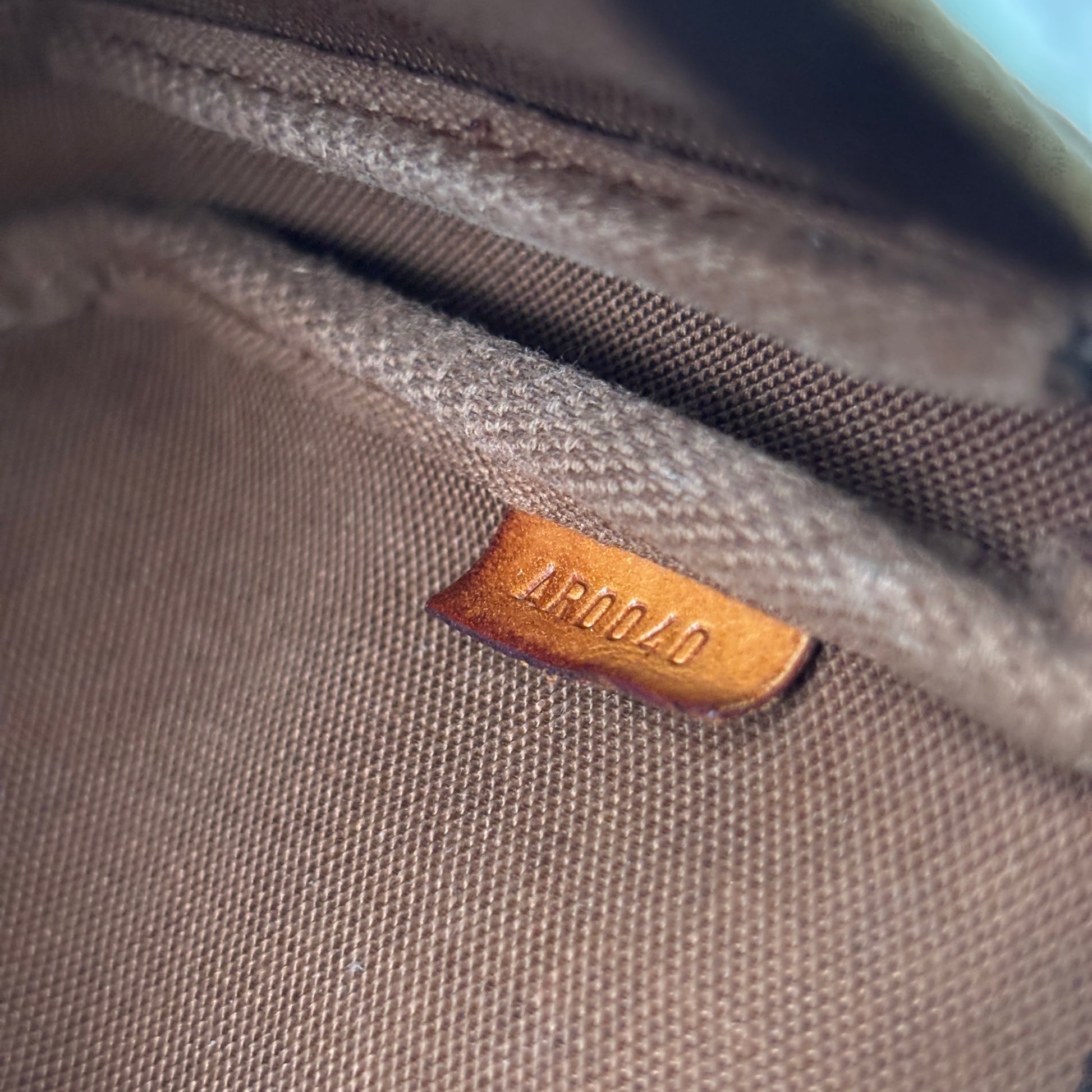 Condition: Good preowned condition - functional with signs of wear. Wear on leather tag, scuffs on canvas. Tarnished hardware has been re-plated (more noticeable on the zipper pull).