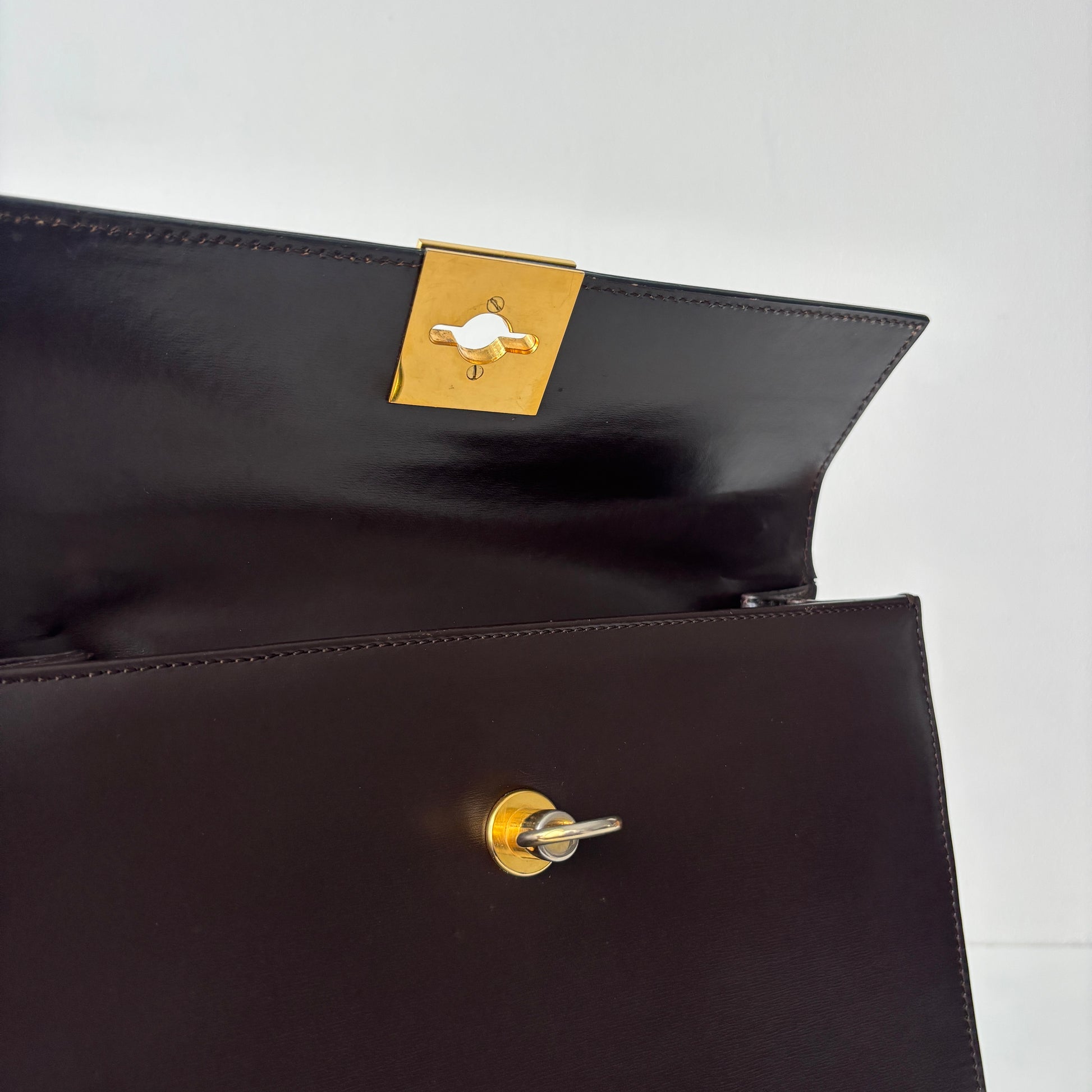 Authentic vintage Celine Leather Top Handle Bag featuring structured dark brown leather and gold tone hardware. Made in Italy.